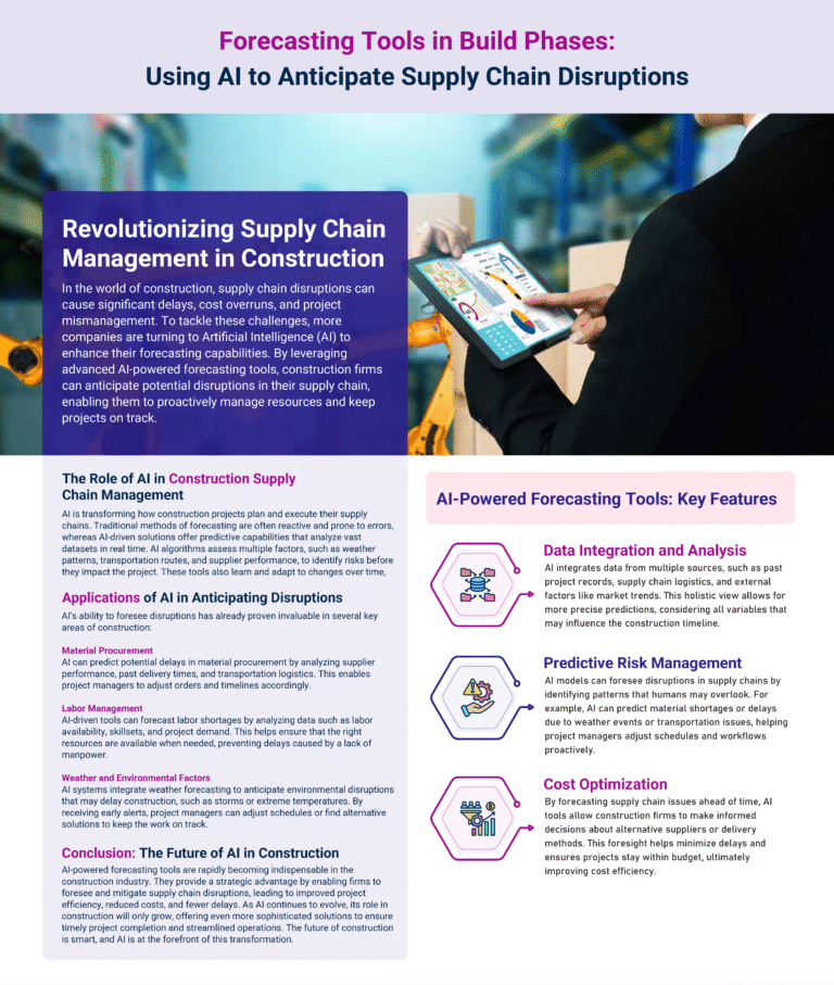 In the world of construction, supply chain disruptions can cause significant delays, cost overruns, and project mismanagement. To tackle these challenges, more companies are turning to Artificial Intelligence (AI) to