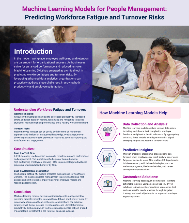 In the modern workplace, employee well-being and retention are paramount for organizational success. As businesses strive for enhanced performance and reduced turnover, Machine Learning (ML) has emerged as a critical tool in predicting workforce fatigue and turnover risks. By leveraging advanced data analytics, organizations can proactively address these challenges, improving both productivity and employee satisfaction.