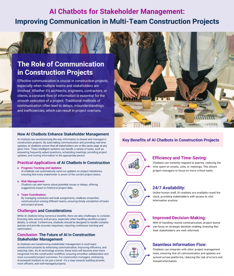 AI chatbots are revolutionizing the way information is shared and managed in construction projects. By automating communication and providing real-time updates, AI chatbots ensure that all stakeholders are on the same page at any given time. These intelligent systems can handle a variety of tasks, such as answering frequently asked questions, scheduling meetings, providing project updates, and routing information to the appropriate person.
